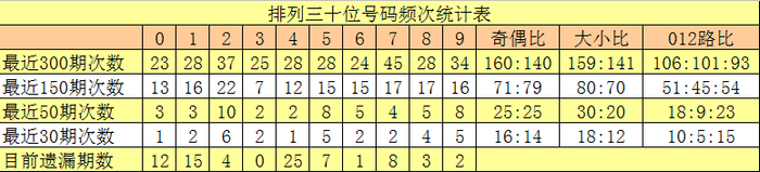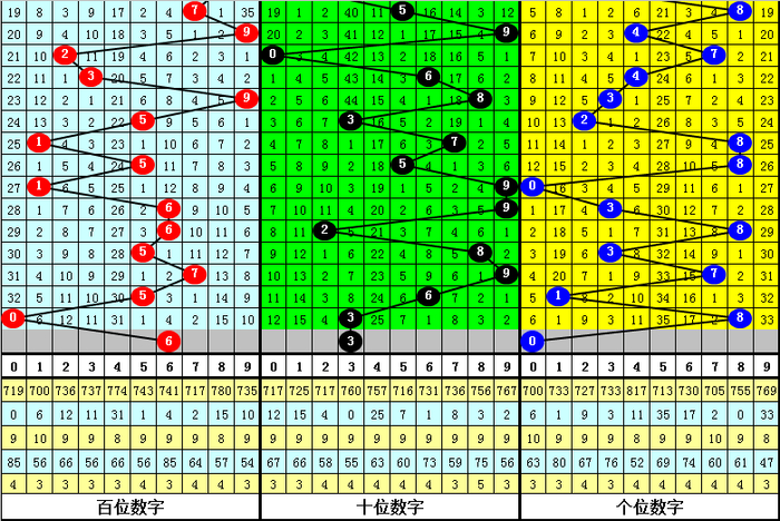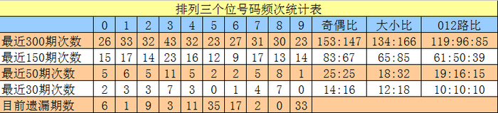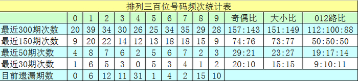 十位号码:前50期走势最活跃的号码为:2开出10个,5、9开出8个;走势最冷的号码为:3、4开出2个,0、1开出3个。十位号码012路比开出18:9:23,大小比开出30:20。本期十位排除两码:0、8,参考号码1、3、4,胆码关注3。