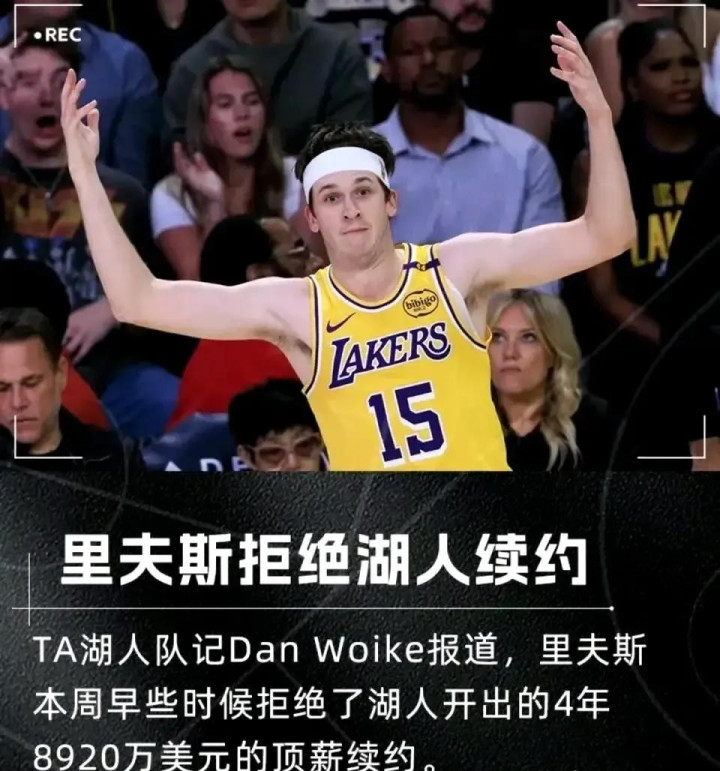 根据湖人队队记的报道,里夫斯已经拒绝了湖人队开出的4年8920美元的现有顶薪续约合同。那么,按照规则里夫斯跳出合同,就可以争取跟湖人队5年2.46亿美元的顶薪合同了!