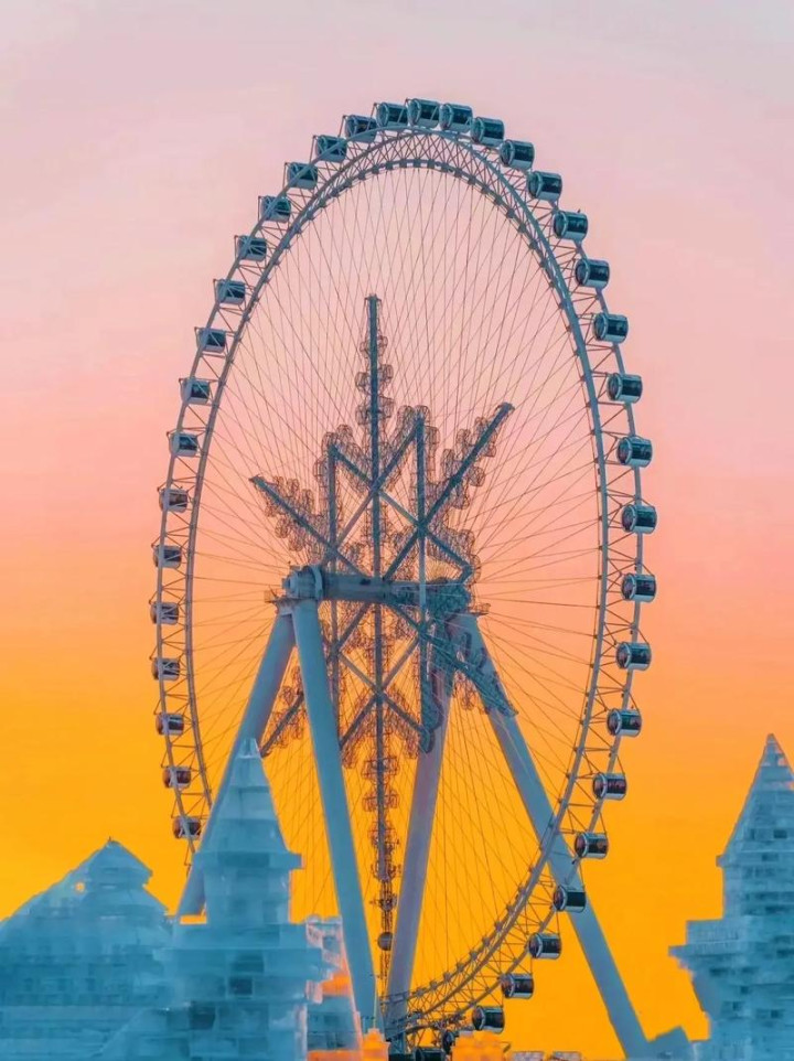 登上高耸入云的摩天轮,从空中俯瞰哈尔滨江畔,冰天雪地的北国风光尽收眼底。