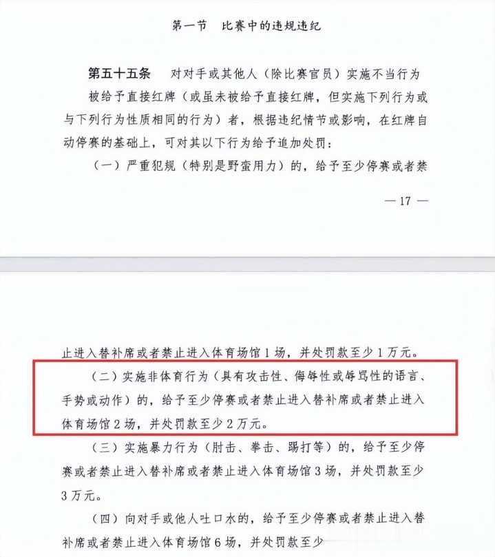 此外,中足联纪律与道德委员会还根据举报及比赛现场画面(包括口型等证据)来认定李镇全辱骂对手。《中国足球职业联赛联合会纪律与道德准则》第55条罚则明确规定,实施此类非体育行为的,将至少面临停赛至少2场、罚款至少2万元的追加处罚。