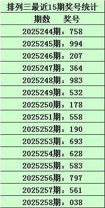 排列三第2025258期开出直选号码038,历史上该号码直选出现7次,前6次出现之后,下期开出号码为:623、060、509、775、994、819,其前后5期分别开出奖号:(统计见下表)