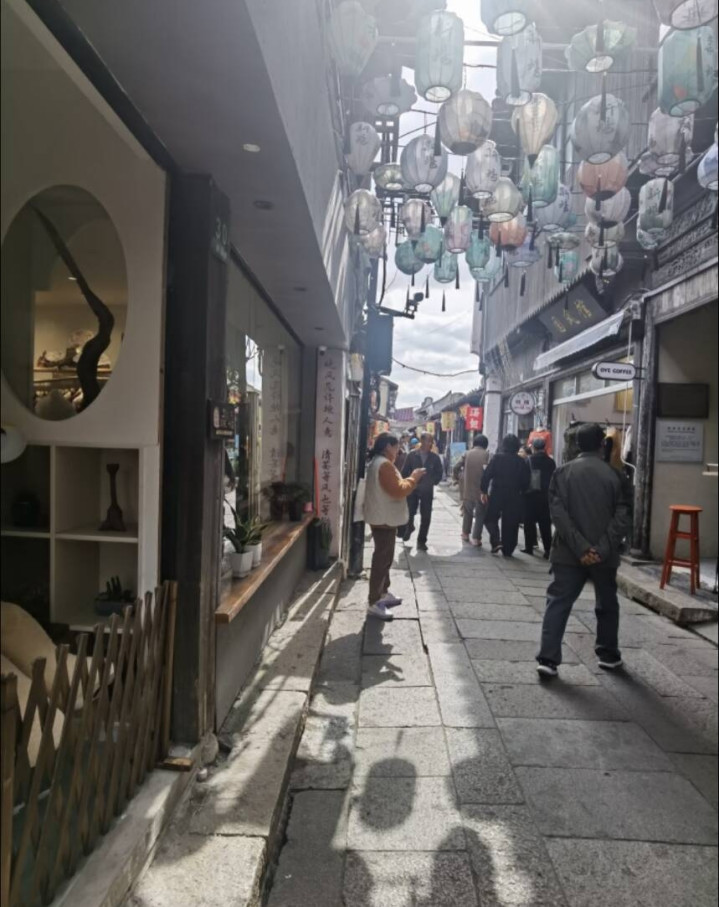 有人说这里的观感不比苏州的木渎周庄差,而新场这边则更加要烟火气息。可是因为生态的原因,也有两个难题。而苏州的古镇,河道比较宽,街道又很敞亮。木渎那边还有灵岩山对着香溪河,坐着摇船过去,看着很舒服。但新场这边古建筑需要保护好,导致街道不好拓宽,所以最近就只有一个相对较窄的巷子,一头看上去很多小吃摊,而另一边则主要售卖工艺品,中间还有一些奶茶店、咖啡店散落着。