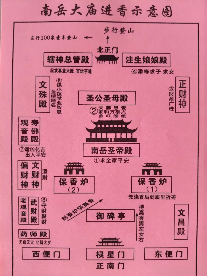 不想爬山的,也可以直接坐环保车到半山亭,然后重点玩几个景点(磨镜台,福严寺.....),最后坐索道上南天门,再步行至祝融峰。