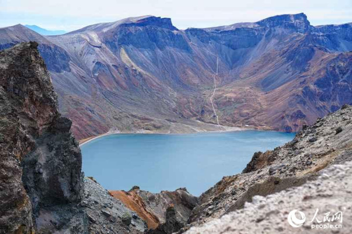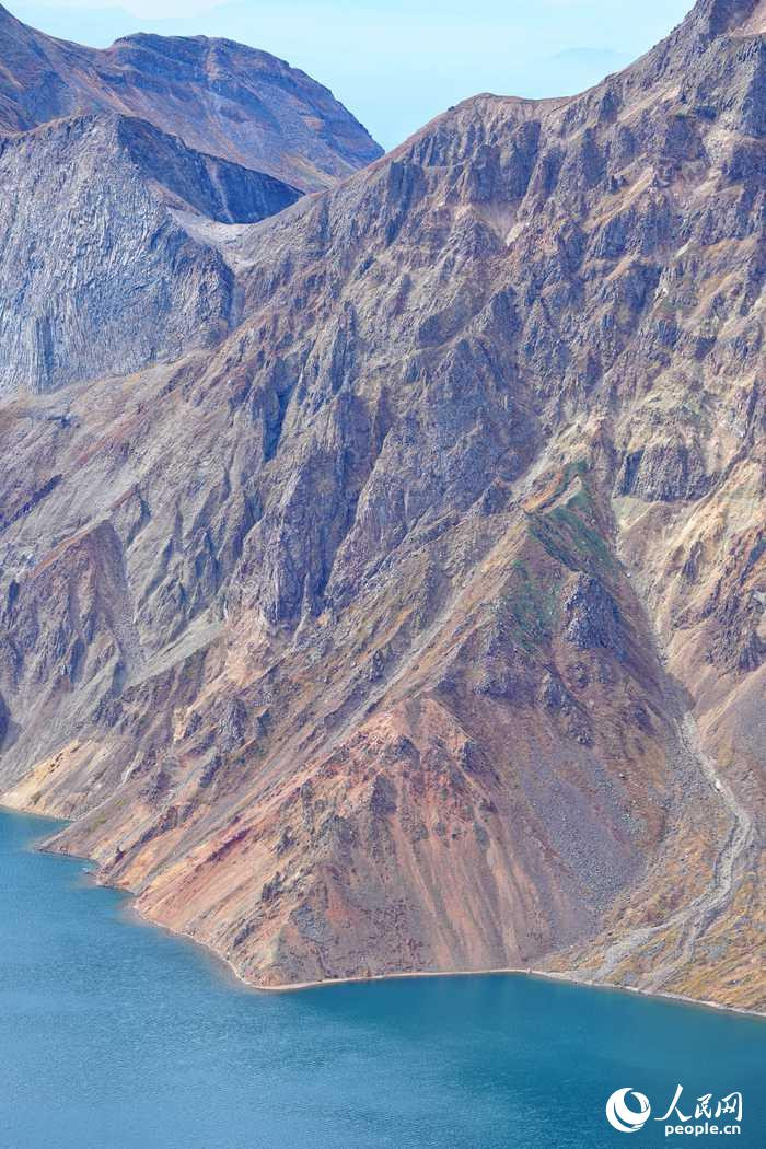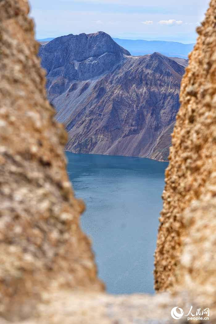 长白瀑布的“灵动”形成鲜明反差的,是天池的“幽静”。一汪清水被海拔超2000米的十六座山峰托举。秋日里的长白山,天高云淡,雾气稀薄,是观赏天池全貌的最佳时机,身旁的导游说道:“秋天,游客看到天池的概率最高。”