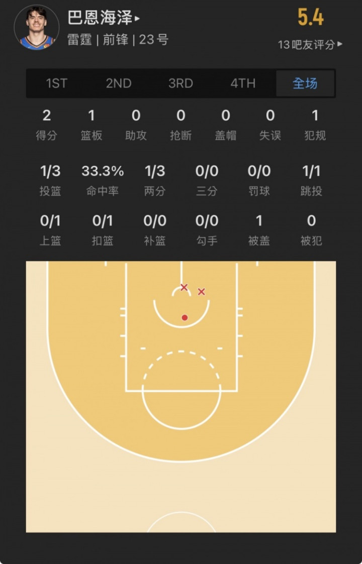 雷霆44号秀布鲁克斯-巴恩海泽登场6.9分钟
