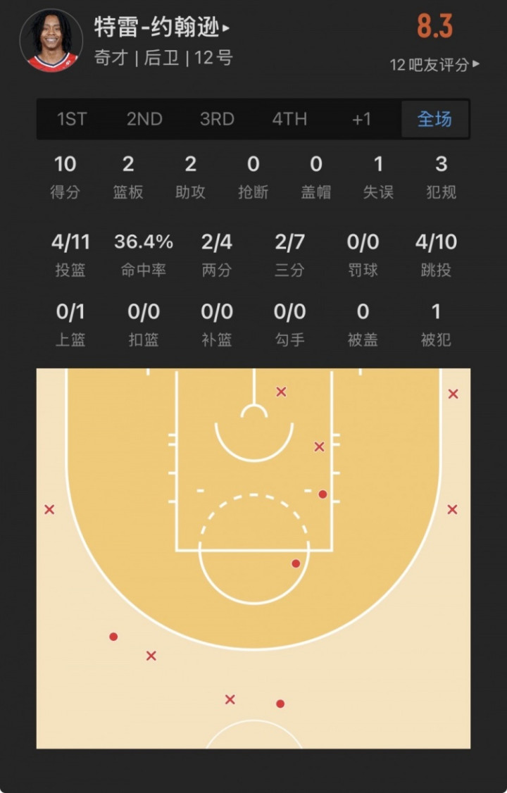 奇才6号秀特雷-约翰逊登场25.8分钟