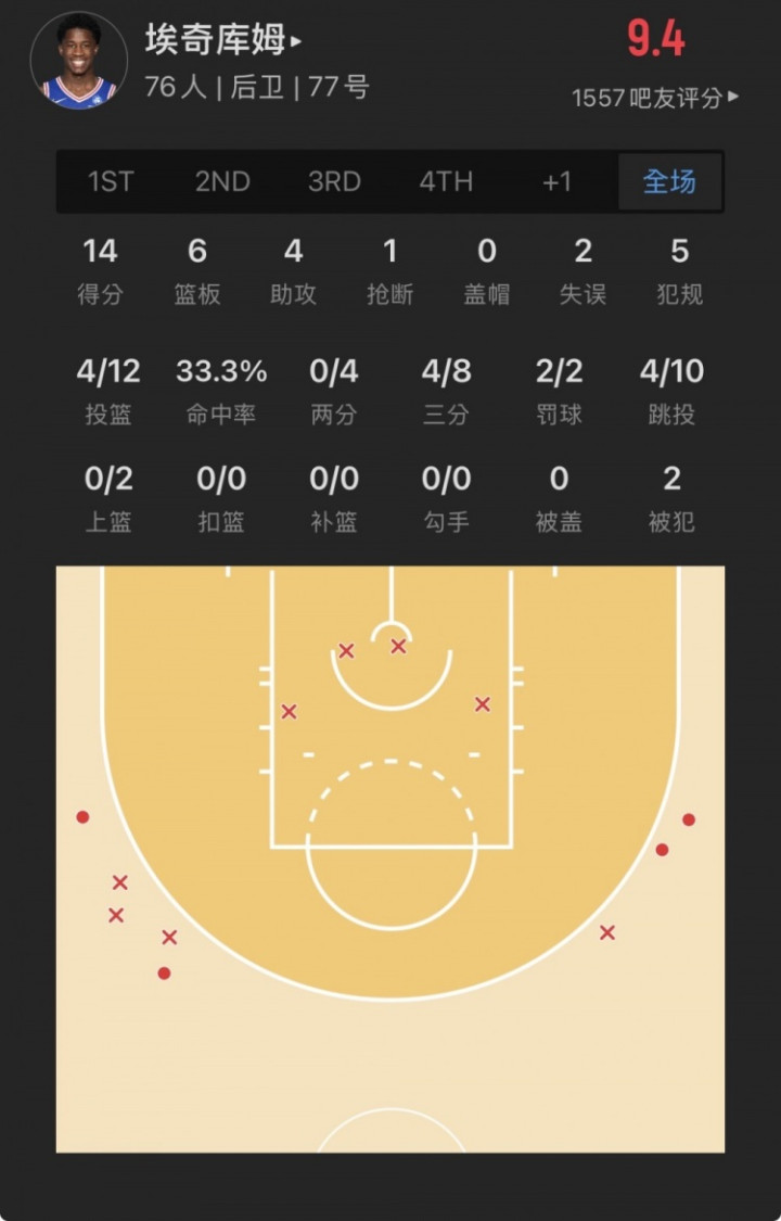 76人探花秀VJ-埃奇库姆登场40.0分钟