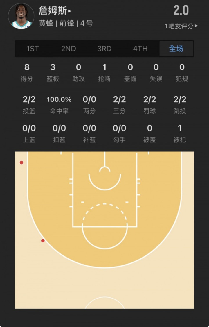 黄蜂33号秀赛恩-詹姆斯登场23.3分钟
